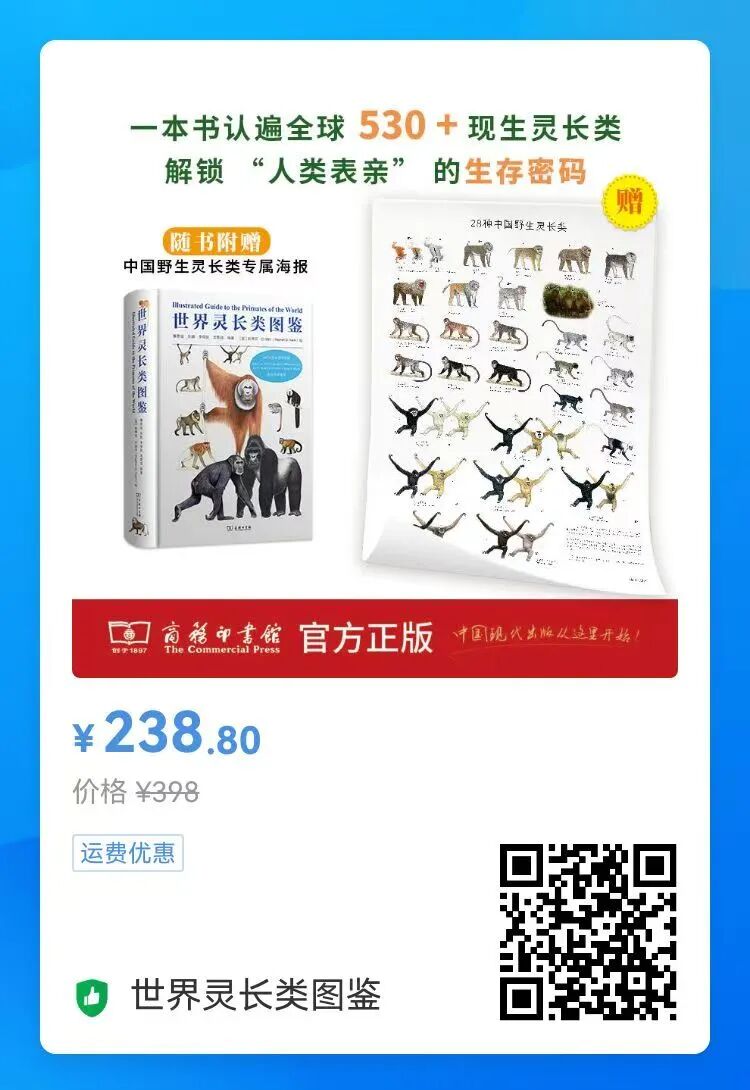 兜兜转转,历时5年,这本收录了全球现生灵长类的《世界灵长类图鉴》终于和读者见面了。全书收录灵长类530余种,手绘图900余幅,另有几十张照片。16开,精装,四色印刷,全书将近700页,随书还附赠一张收录28种中国野生灵长类的海报。目前还有新书专享优惠,喜欢的话,现在扫描文后的二维码下单入手吧。
